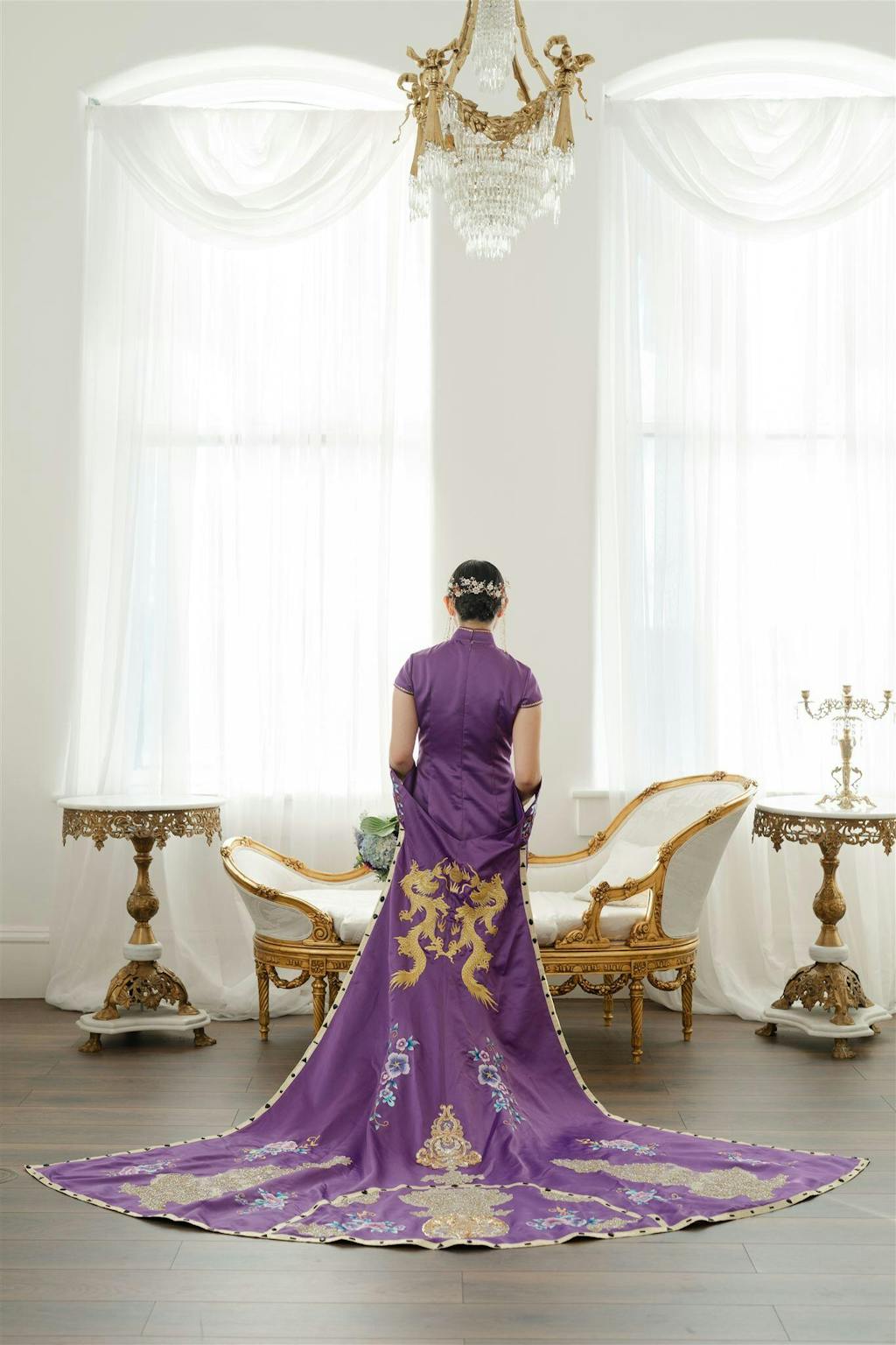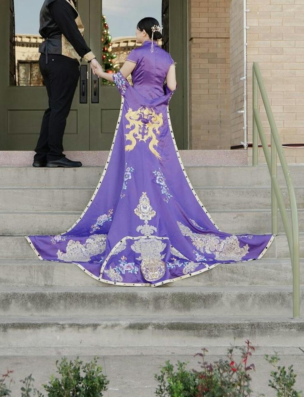 When I first saw this wedding dress, I knew it was the one. The detail on this dress is so beautiful and purple is my favorite color. I did find getting the measurements to be a little confusing, so I would definitely confer with a professional tailor just in case. FYI, there are rhinestones on the embroidered flowers. I also ordered a custom cape with similar designs to this dress. I love this dress so much!
