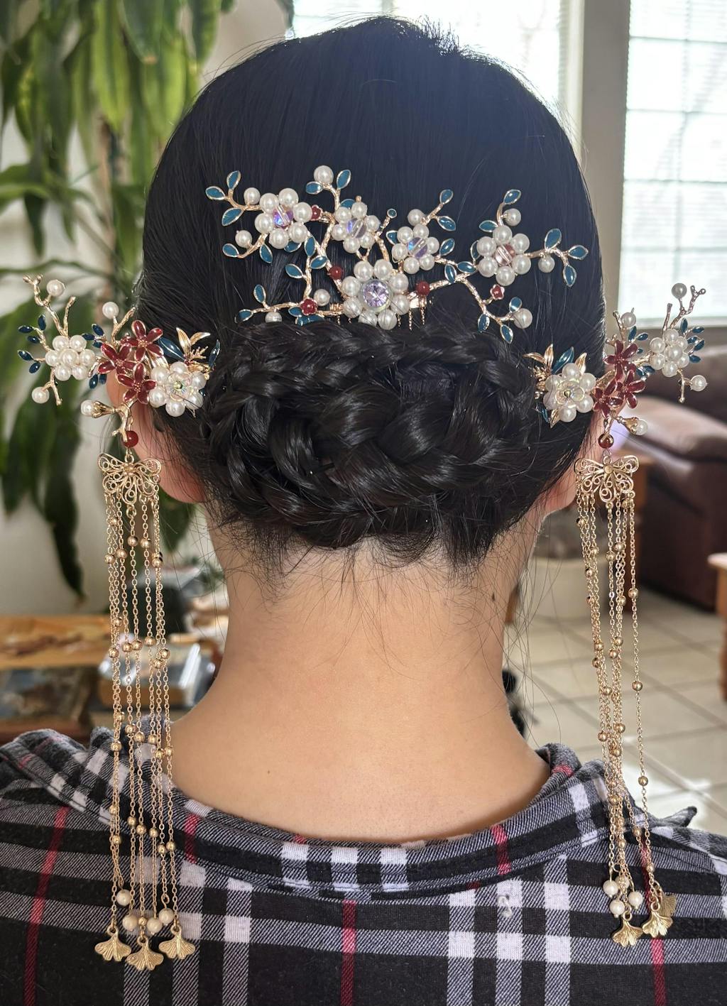 I wore these hairpins for my wedding and reception; they are beautiful! The chains do get tangled easily, but look beautiful in photos nonetheless. FYI, the hairpins I received were not the design in the first photo (the chains with fans on them), but were like the ones in the other photos (the chains with butterflies on the ends); they were still beautiful and were actually a better fit for my Tammy dress.
